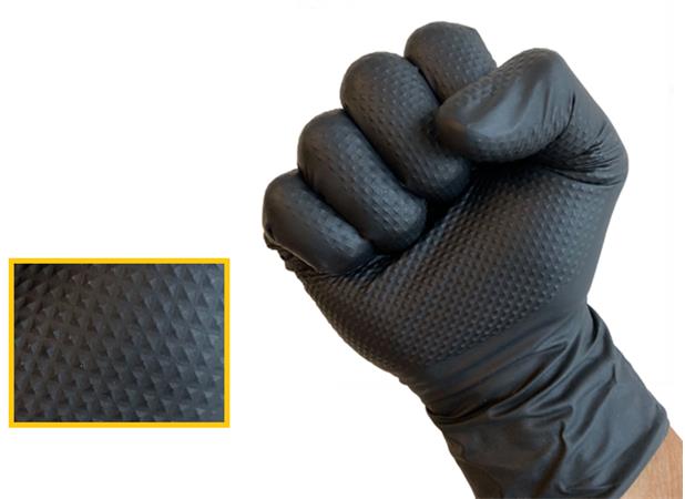 Jednorazové ochranné rukavice bez latexu, prémiová odolnosť. -nesterilné -nepudrované extra zdrsnená dlaň a prsty -s navinutým lemom --vhodné pre obe ruky -neobsahuje latex -materiál: nitril (8,4gr / 7.0 mil) AQL: 1,5 -dĺžka: 240 mm -farba: čierna -balenie: 100 ks/krabica, 10 krabíc/kartón -EU norma: 2016/425; EN ISO 374-1:2016 (JKPT); EN ISO 374-5:2016; EN 420: 2003+A1: 2009; 2017/745